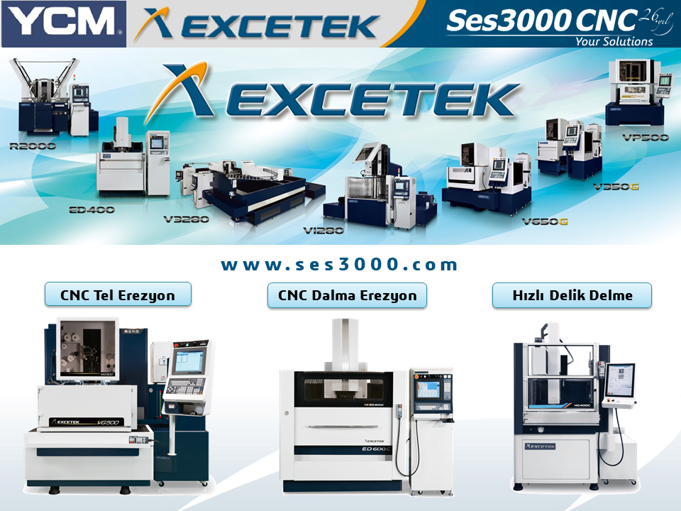 1994 Yılından bu yana Türkiye distribütörü olduğumuz Taiwan’ın en köklü ve konusunda lider firması YCM (Taiwan) ‘in, Tiawan’ın EREZYON konusunda yenilikçiliği ile öne çıkan YENİ NESİL Firma EXCETEK Firmasını satın alması ile bizler de SES3000 CNC olarak Türkiye satışlarını yapmaya başladık. Başta kalıpçılar olmak üzere sanayimizin her alanında sattığımız ve satış sonrası hizmetlerini başarılı şekilde yürüttüğümüz EXCETEK ‘in; TEL EREZYON, DALMA EREZYON ve HIZLI DELİK DELME Serileri olarak onlarca modelleri vardır.