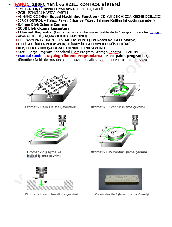 - Manual Guide – Diyalog Yöntemi Programlamaya Hazır paket programlar, döngüler (Delik delme, diş açma, havuz boşaltma v.s. gibi) ve kullanım klavuzu