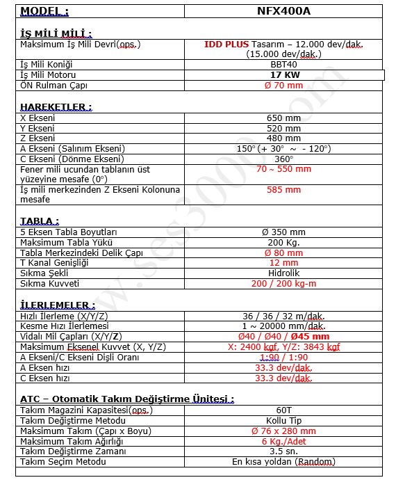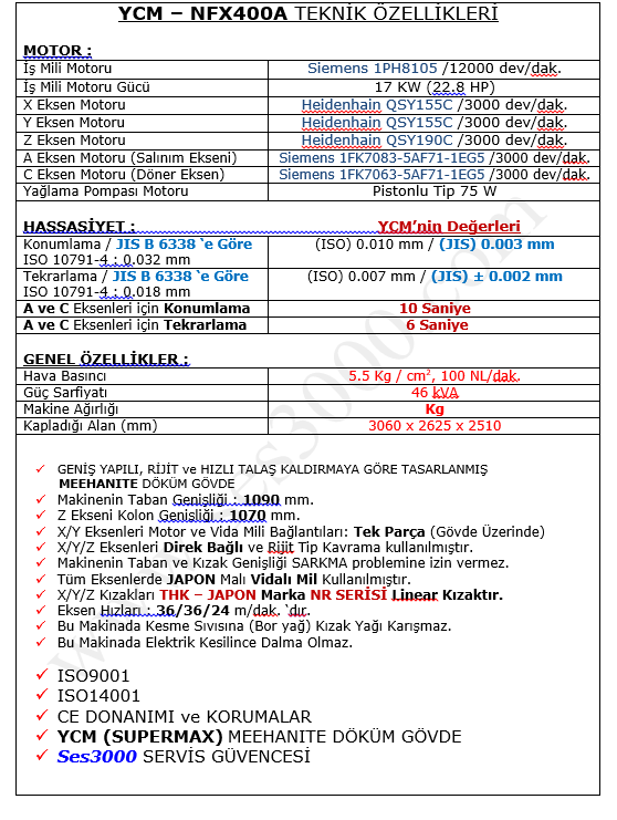 YCM – NFX400A TEKNİK ÖZELLİKLERİ