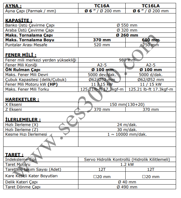 - Maksimum Tornalama Boyu : TC16A: 370 mm / TC16LA: 600 mm