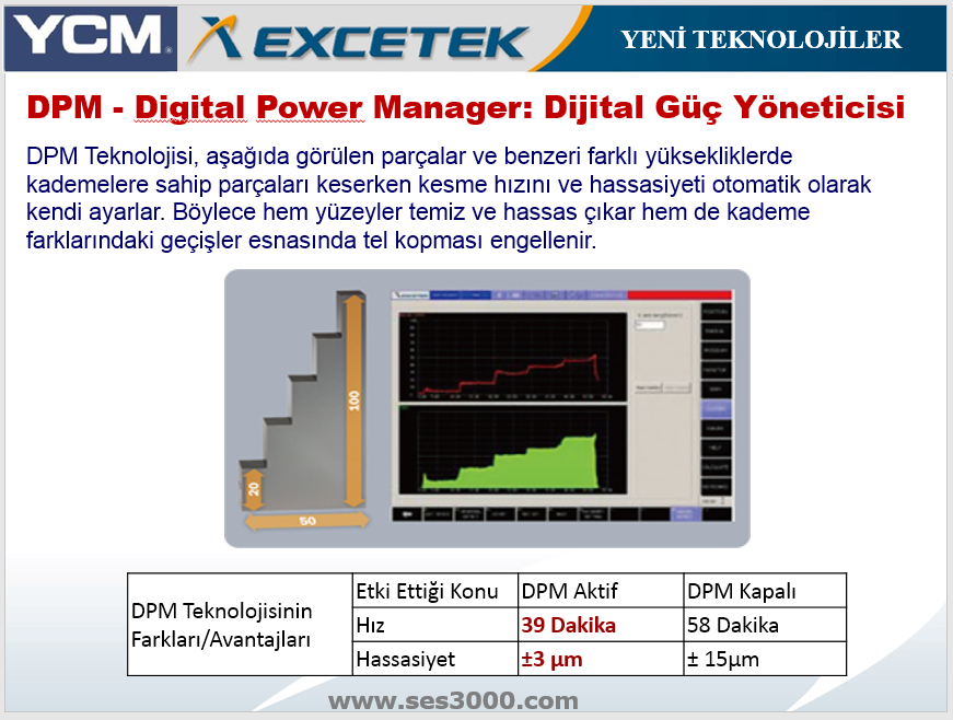 - DPM – Dijital Güç Yöneticisi Modülü ile farklı yüksekliklerdeki kademeli parçaları keserken hızı, ilerlemeyi ve hassasiyeti makine kendisi ayarlar. (Opsiyon)