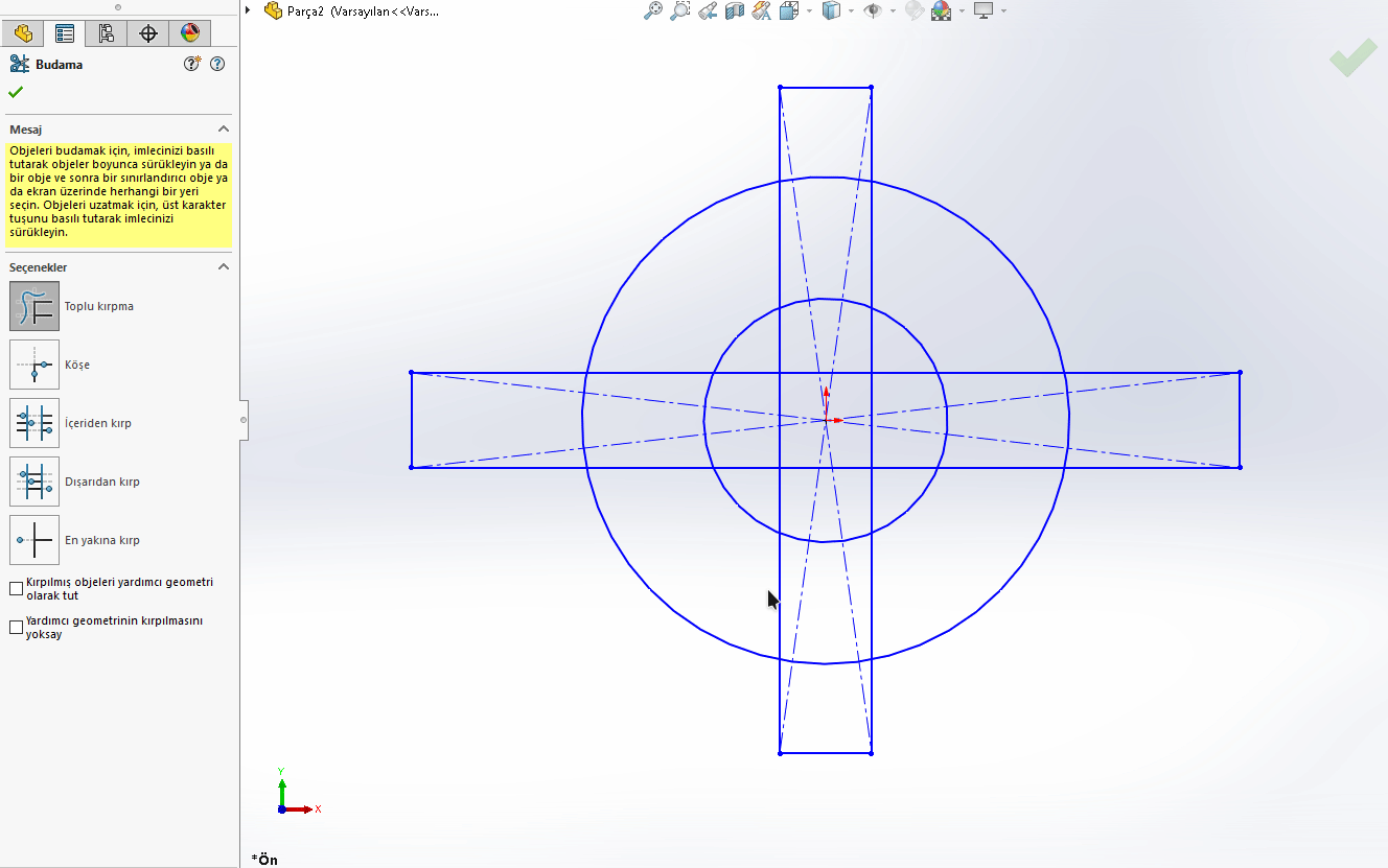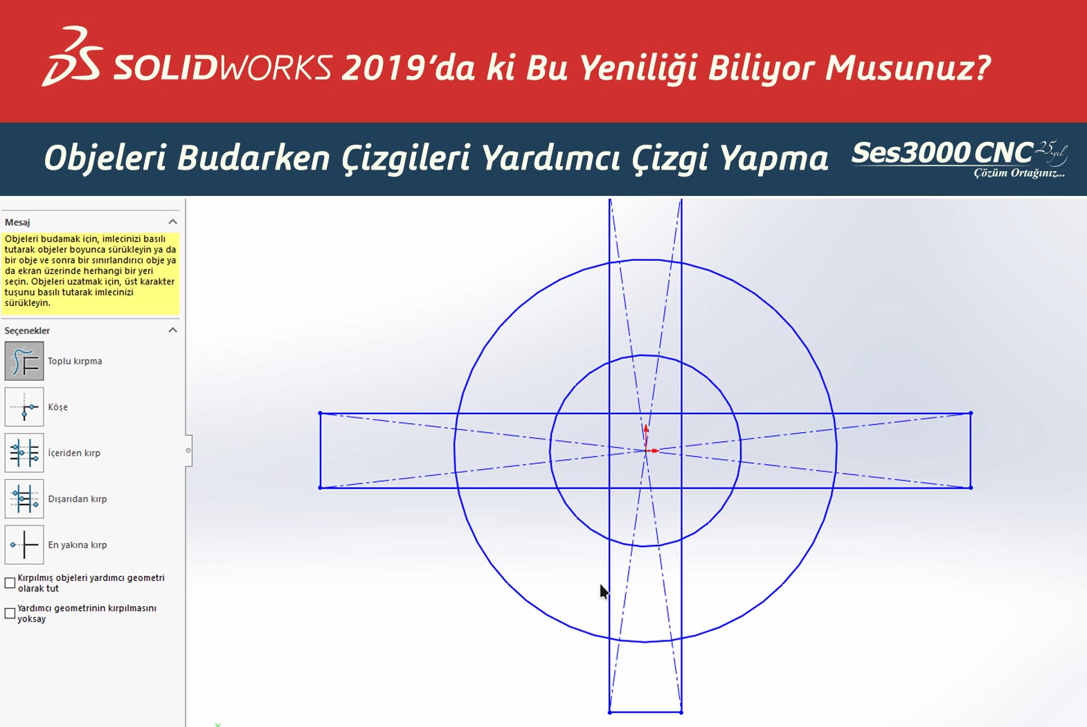 SOLIDWORKS 2019 ile birlikte objeleri budarken gelen seçenekle birlikte kırpılmış ögeleri yardımcı çizgi olarak tuta bilmekteyiz. Ve yine gelen yenilik sayesinde yardımcı çizgileri budama işlemi dışında bırakabiliyoruz.