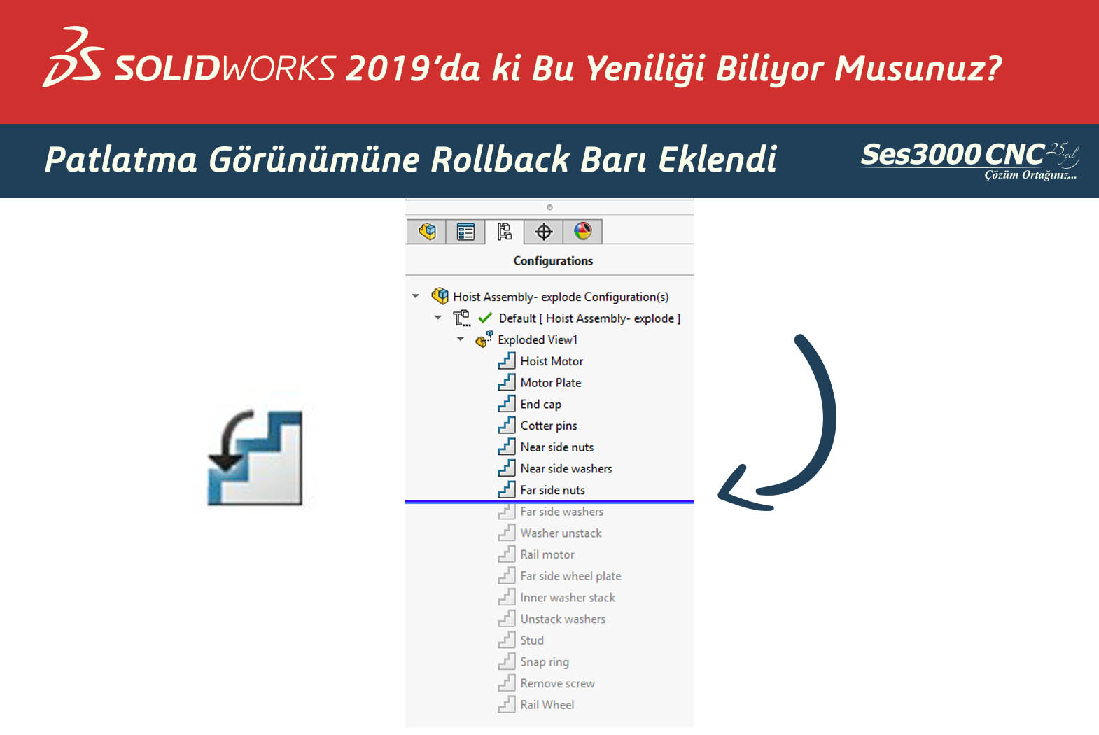 SOLIDWORKS 2019 ile artık patlatma görünümlerinizi çok daha kolay yapabileceksiniz. Rollback barı sayesinde düzenlemeleri yaparken araya yeni patlatma adımları eklemek ve bu adımların sıralarını düzenlemek bu iş için harcadığını zamanınızdan tasarruf etmenize yardımcı olacak.