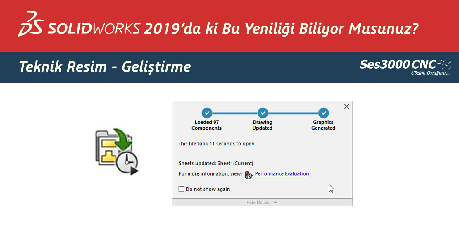 SOLIDWORKS 2019 ile artık montajlarınızı açarken gördüğünüz bilgi ekranını teknik resimler içinde görebileceksiniz. Bu şekilde teknik resim açma performansınızı takip ederek, problem olduğunda bunu önizleyebileceksiniz.