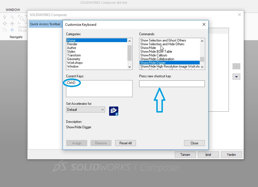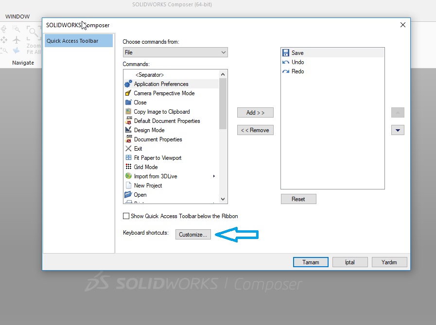 SOLIDWORKS Composer Klavye Kısayolları işlevini aşağıdaki resimlerden adımları takip ederek oluşturabilirsiniz.
