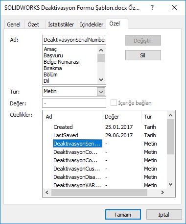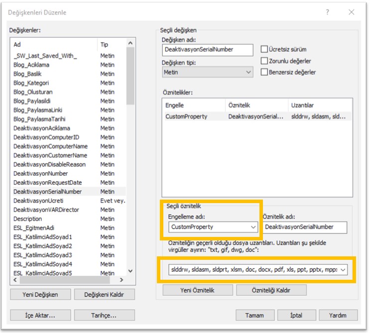 Bu noktada kullanmak istediğimiz değişkene bir Öznitelik atıyoruz. Öznitelik seçeneğimizi ise Word ve Excel dosyalarının değişkeni görebilmesini sağlayan CustomProperty olarak ayarlıyoruz. Dosya uzantıları kısmına docx, doc, xlsm uzantılarını ekliyoruz.
