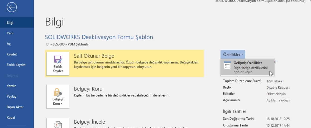 Dosya kartlarmız ve değişkenlerimizi ayarladıktan sonra oluşturmak istediğimiz dokümanların ayarlarına geçiyoruz. Dosya > Bilgi > Özellikler > Gelişmiş Özellikler seçeneğine giriyoruz.