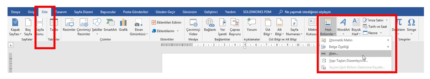 Değişkenlerimizi de dokümana tanıttıktan sonra değişkenlerin nereye konumlandırılacağını ayarlamamız gerekiyor. Bunun için Ekle sekmesinden Hızlı Bölümler > Alan komutuna giriyoruz.