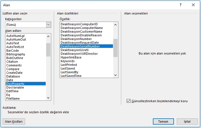 Karşımıza çıkan pencerede Alan adı olarak DocProperty seçeneğini seçiyoruz ve öncesinde tanıttığımız değişkenlerden hangisini eklemek istiyorsan seçimimizi yaparak onaylıyoruz. Bu şekilde hangi değişkenleri kullanmak istiyorsak onları istenilen konumlara ekliyoruz.