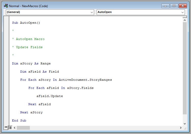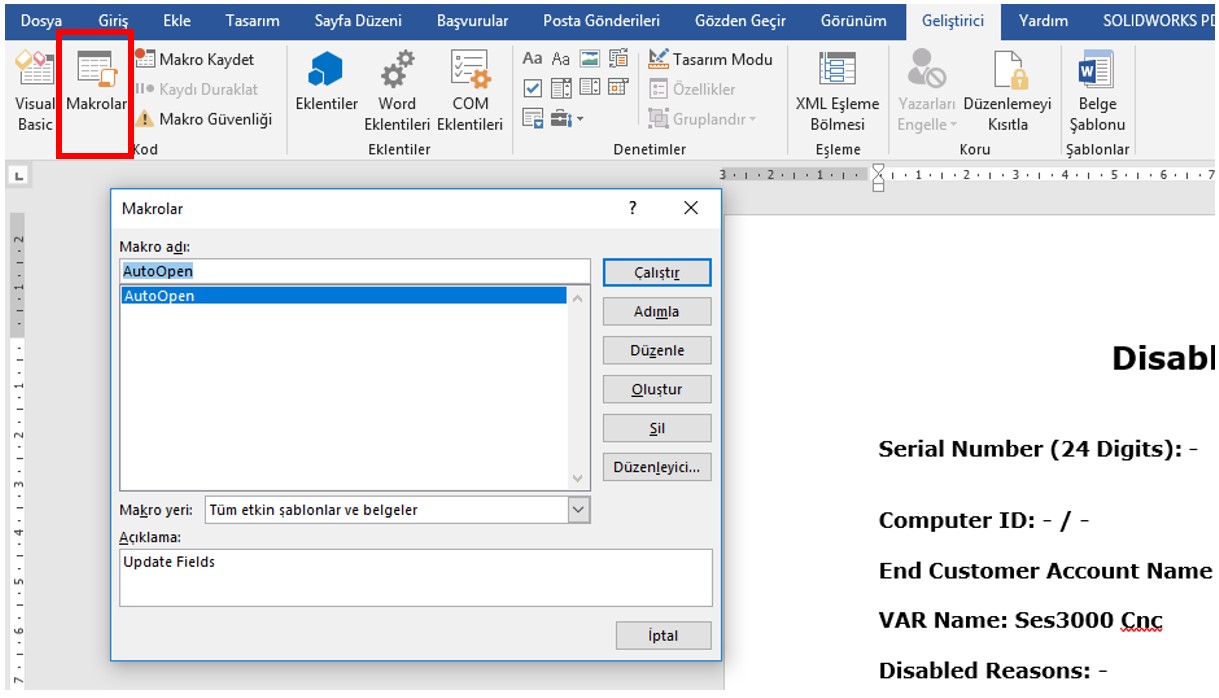Son olarak doküman açıldığında otomatik olarak Alanı güncelleştirmesi için bir makro ekliyoruz. Geliştirici > Makrolar seçeneğini açıyoruz ve AutoOpen adında bir makro oluşturup düzenle diyoruz.
