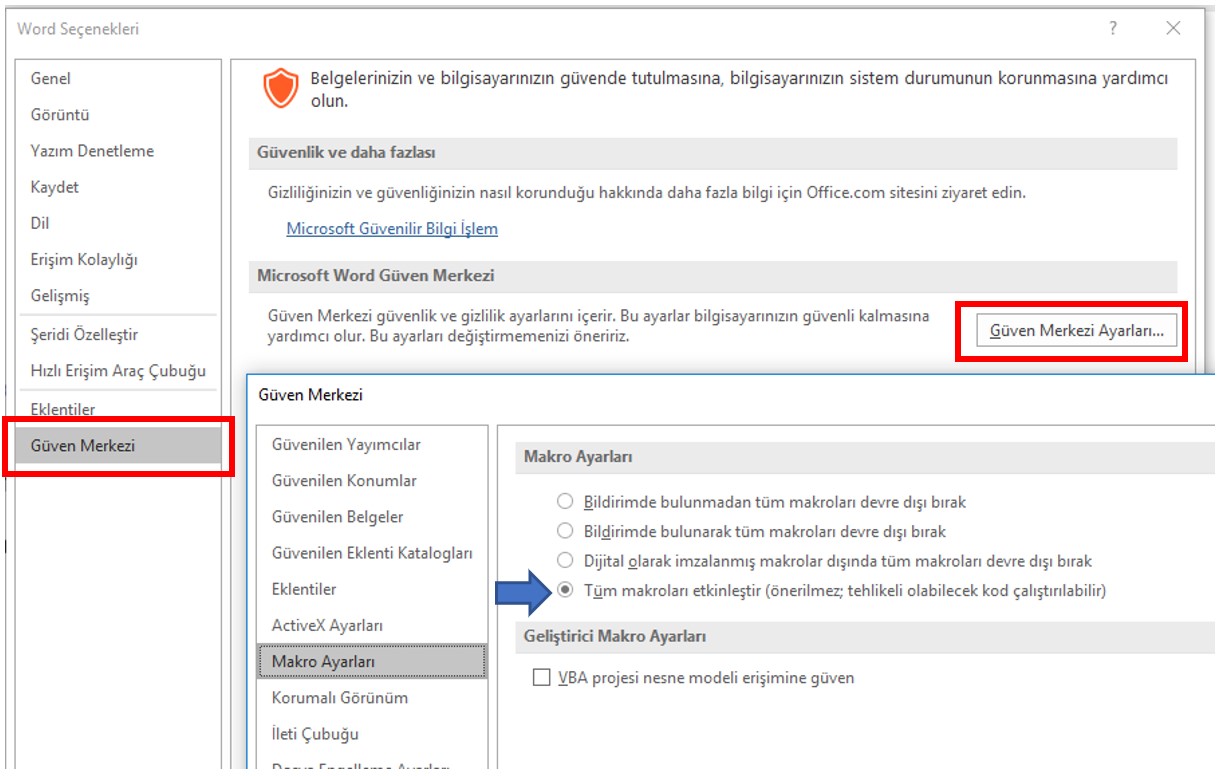Önemli bir not olarak makronun çalışması için Dosya > Seçenekler> Güven Merkezi > Güven Merkezi Ayarları kısmına geliyoruz. Makro Ayarları kısmını aşağıdaki gibi ayarlıyoruz.