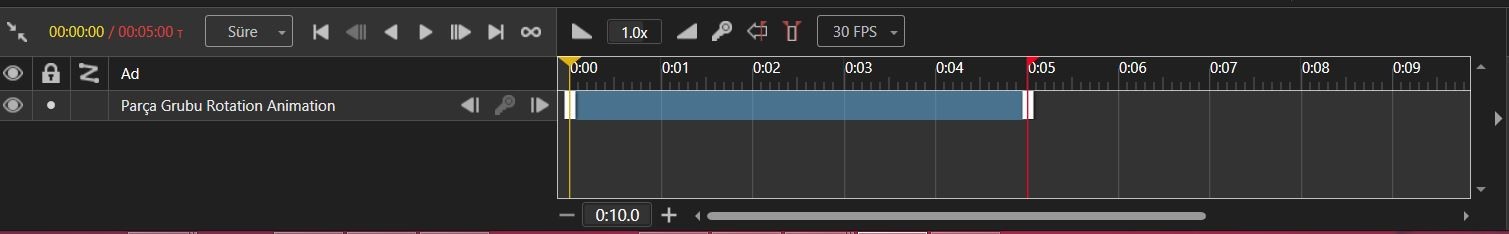 Sağ panelde Modeller kısmında parçalara ya da parça gruplarına rotasyon animasyonu ekleyebiliriz time-line kısmına 5 saniyelik bir rotasyon animasyonu gelecektir.