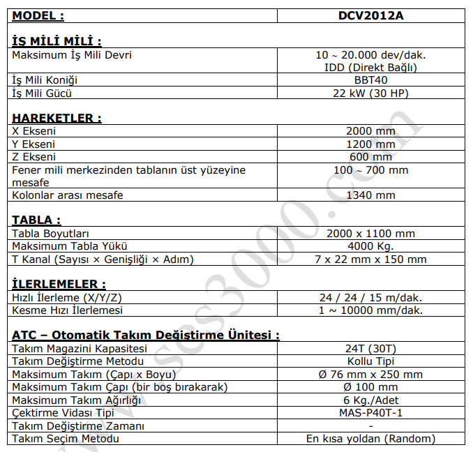 - İŞLEME BOYUTLARI : X2000 mm, Y1200 mm, Z600 mm