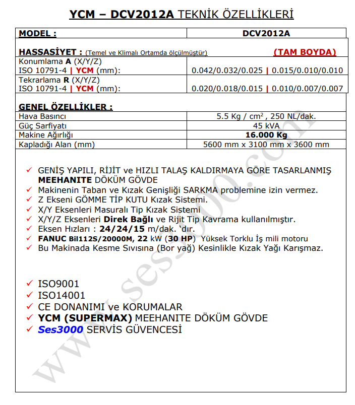 YCM – DCV2012A TEKNİK ÖZELLİKLERİ