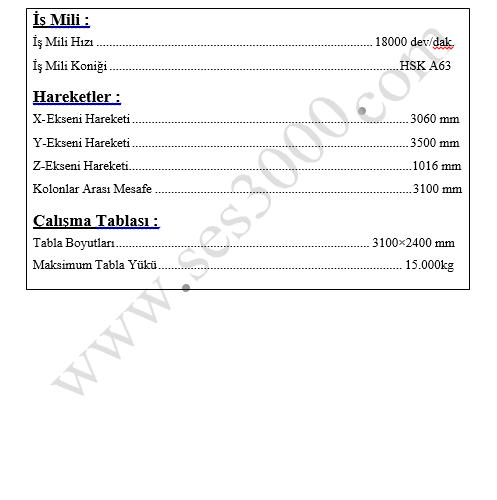 - HIZLI (Boşta) İLERLEME HIZI (X,Y,Z) : 20 / 20 /15 m/dak