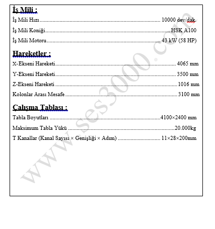 - HIZLI (Boşta) İLERLEME HIZI (X,Y,Z) : 20 / 20 /15 m/dak